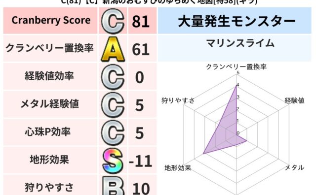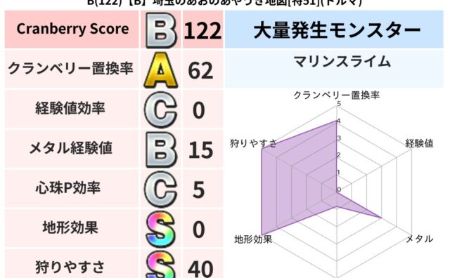 クランベリーボット判定結果の詳細クランベリースコア:114クランベリー置換率:63%大量発生モンスター:マリンスライムデイン超耐性(52%)こころ道 完全一致モンスターかっちゅうアリ: 魔人(共通Lv1)フロストギズモ: 魔剣士(魔道Lv5...
