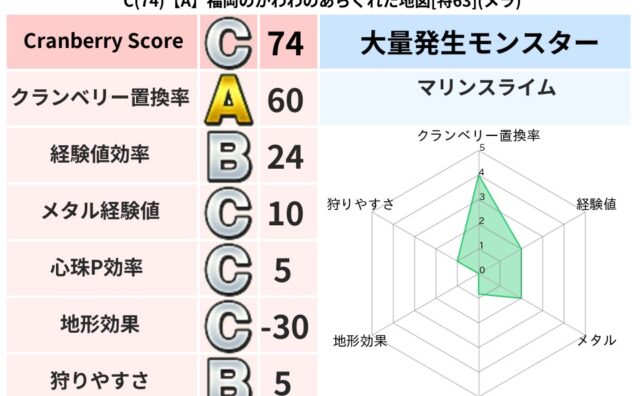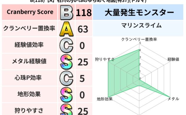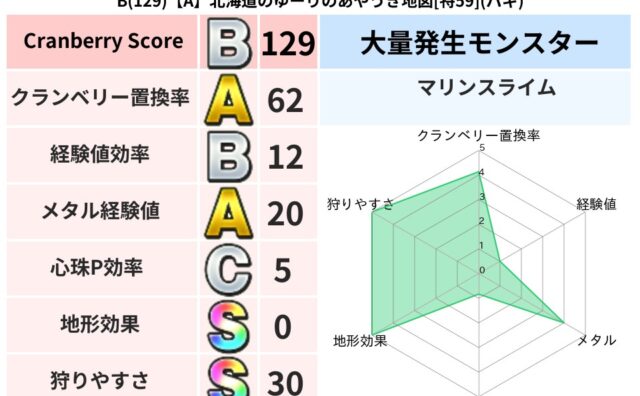 クランベリーボット判定結果の詳細クランベリースコア81クランベリー置換率61%大量発生モンスターマリンスライム,ドラゴンキッズ超耐性ドルマ(0%)こころ道 完全一致モンスターストーンマンゴッドハンド(守護道Lv5)たてまじん魔剣士(魔道Lv...
