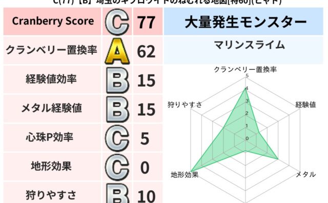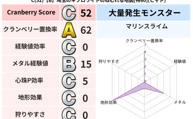 クランベリーボット判定結果の詳細クランベリースコア:49クランベリー置換率:63%大量発生モンスター:マリンスライムドルマ超耐性(0%)こころ道 完全一致モンスターフレイム: 守り人(ささえ道Lv5)かっちゅうアリ: 魔人(共通Lv1)ダー...