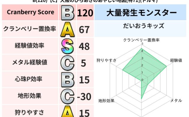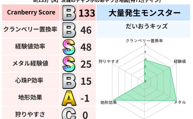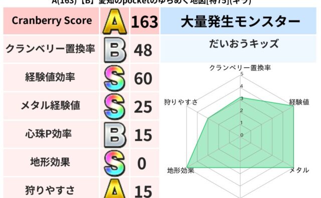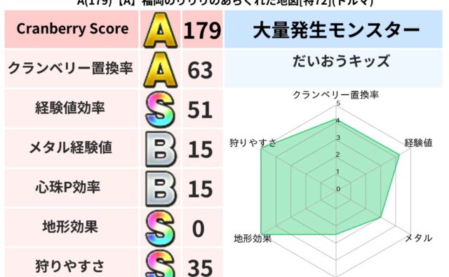 スコアA A(179)【A】福岡のりりりのあらくれた地図[特72](ドルマ) クランベリーボット判定結果の詳細クランベリースコア179クランベリー置換率63%大量発生モンスターだいおうキッズ超耐性ドルマ(0%)超耐性・弱耐性なしバギ系統狩りエレメント系41%こころ道 完全一致モンスタードロヌーバニンジャ(波道Lv5)... 2025/09/01 21:59 スコアA地図判定結果