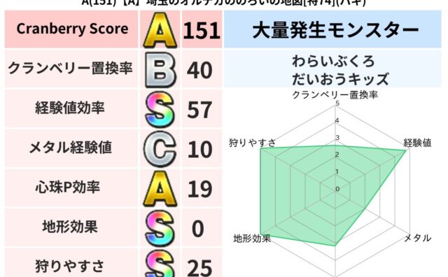 スコアA A(151)【A】埼玉のオルテガののろいの地図[特74](バギ) クランベリーボット判定結果の詳細クランベリースコア151クランベリー置換率40%大量発生モンスターわらいぶくろ,だいおうキッズ超耐性バギ(0%)超耐性・弱耐性なしジバリアこころ道 完全一致モンスターさまようよろいゴッドハンド(守護道Lv5)... 2025/09/24 10:11 スコアA地図判定結果