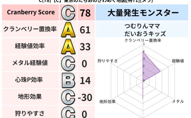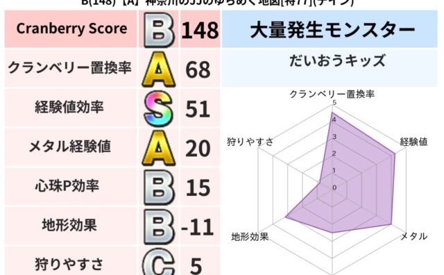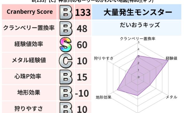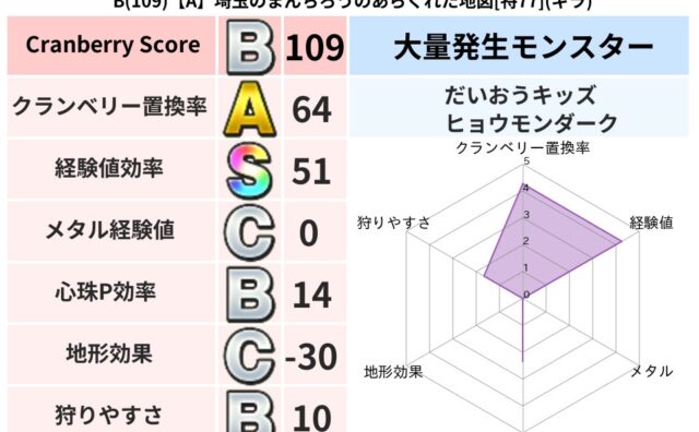 クランベリーボット判定結果の詳細クランベリースコア143クランベリー置換率66%大量発生モンスターだいおうキッズ超耐性ドルマ(0%)こころ道 完全一致モンスターどくイモムシニンジャ(波道Lv5)フレイム守り人(ささえ道Lv5)かっちゅうアリ...