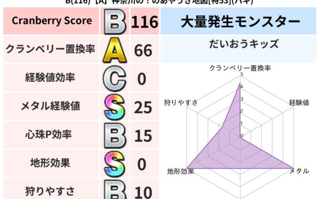 クランベリーボット判定結果の詳細クランベリースコア116クランベリー置換率66%大量発生モンスターだいおうキッズ超耐性バギ(0%)こころ道 完全一致モンスターしのどれいゴッドハンド(守護道Lv5)大魔道士(魔力道Lv5)ヒートギズモ守り人(...