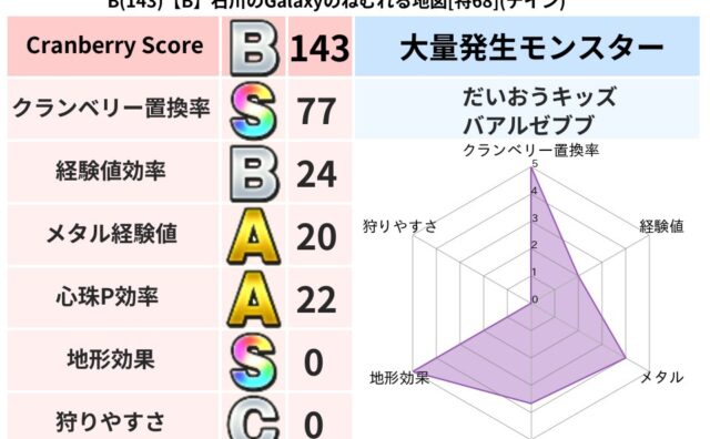 クランベリーボット判定結果の詳細クランベリースコア:115クランベリー置換率:65%大量発生モンスター:だいおうキッズヒャド超耐性(93%)超耐性・弱耐性なし:ジバリアこころ道 完全一致モンスターくさった死体ゴッドハンド(守護道Lv5),大...
