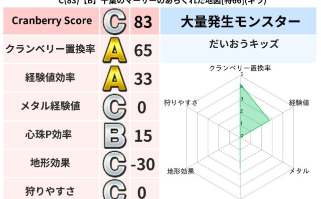 クランベリーボット判定結果の詳細クランベリースコア:135クランベリー置換率:67%大量発生モンスター:だいおうキッズヒャド超耐性(81%)系統狩り(40%)こころ道 完全一致モンスターどれいへいし: ドラゴン(人道Lv5)ストーンマン: ...