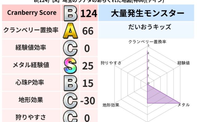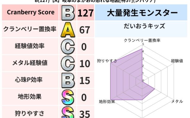 クランベリーボット判定結果の詳細クランベリースコア127クランベリー置換率67%大量発生モンスターだいおうキッズ超耐性ジバリア(0%)超耐性・弱耐性なしデインこころ道 完全一致モンスターだいまどうゴッドハンド(武道Lv40)ぐんたいガニ守り...