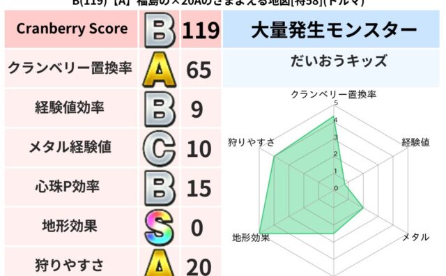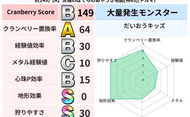 クランベリーボット判定結果の詳細クランベリースコア109クランベリー置換率78%大量発生モンスターだいおうキッズ超耐性ジバリア(9%)こころ道 完全一致モンスターデビルアーマー大神官(舞道Lv5)ストーンマンゴッドハンド(守護道Lv5)リカ...