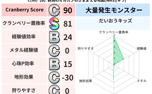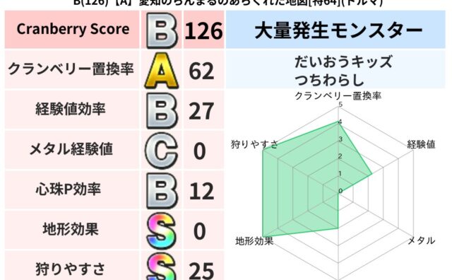 クランベリーボット判定結果の詳細クランベリースコア:105クランベリー置換率:81%大量発生モンスター:だいおうキッズギラ超耐性(0%)こころ道 完全一致モンスターストーンマン: ゴッドハンド(守護道Lv5)まどうし: ゴッドハンド(守護道...