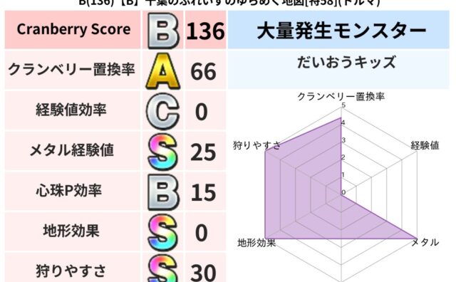 クランベリーボット判定結果の詳細クランベリースコア136クランベリー置換率66%大量発生モンスターだいおうキッズ超耐性ドルマ(0%)こころ道 完全一致モンスターフロストギズモ魔剣士(魔道Lv5)キャットフライニンジャ(共通Lv1)かっちゅう...