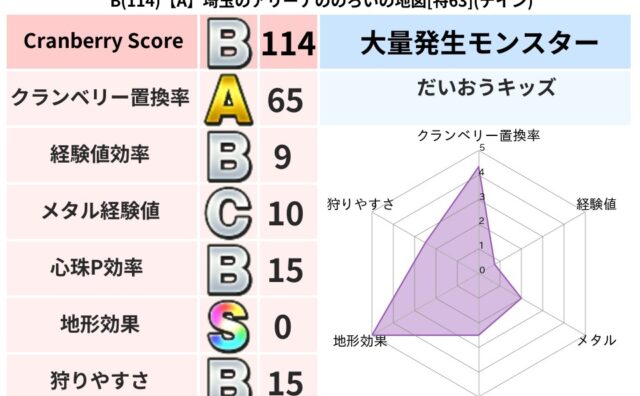 クランベリーボット判定結果の詳細クランベリースコア:99クランベリー置換率:68%大量発生モンスター:だいおうキッズギラ超耐性(0%)こころ道 完全一致モンスターベロニャーゴ: 大魔導士(理力道Lv5)おおさそり: ゴッドハンド(武道Lv5...