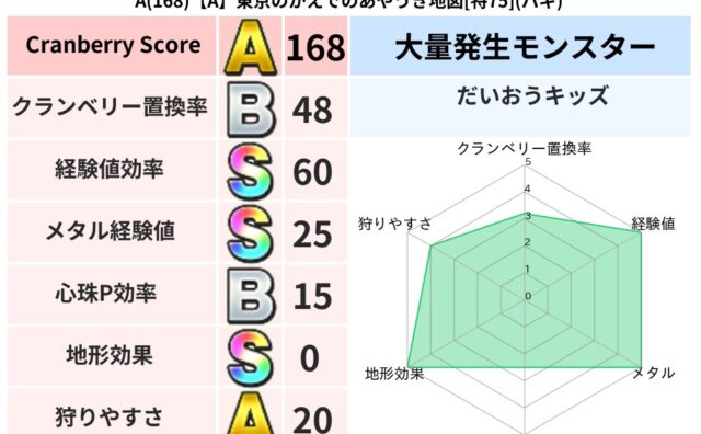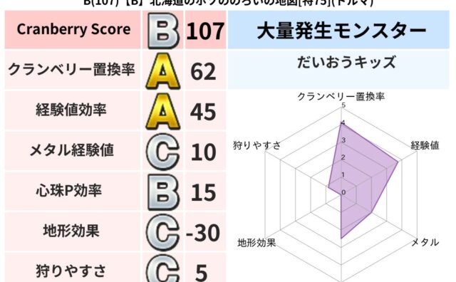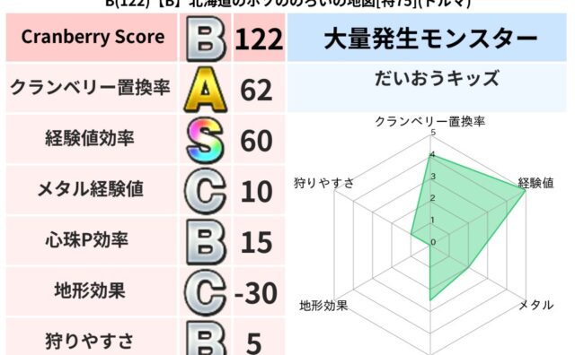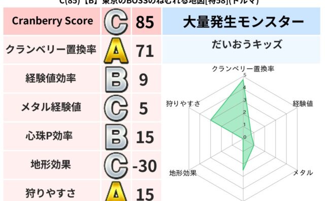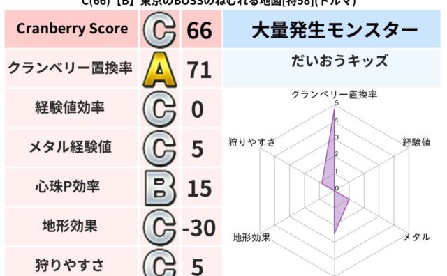 クランベリーボット判定結果の詳細クランベリースコア:84クランベリー置換率:61%大量発生モンスター:だいおうキッズ,ナスビナーラジバリア超耐性(46%)こころ道 完全一致モンスターキャットフライニンジャ(共通Lv1)がいこつ魔剣士(共通L...