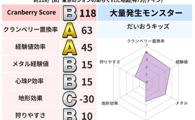 クランベリーボット判定結果の詳細クランベリースコア74クランベリー置換率63%大量発生モンスターだいおうキッズ超耐性イオ(89%)超耐性・弱耐性なしドルマこころ道 完全一致モンスターみならいあくまニンジャ(風道Lv5)かっちゅうアリ魔人(共...