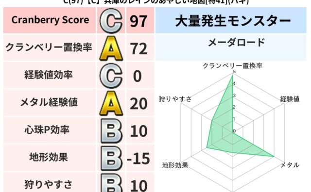 地図判定結果 C(97)【C】兵庫のレインのあやしい地図[特41](バギ) クランベリーボット判定結果の詳細クランベリースコア:97クランベリー置換率:72%大量発生モンスター:メーダロードバギ超耐性(12%)系統狩り(43%)こころ道 完全一致モンスターがいこつ魔剣士(共通Lv1)ヒートギズモ守り人(ささえ道Lv... 2025/09/14 21:21 地図判定結果