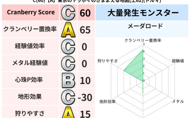 地図判定結果 C(60)【A】東京のヤッポイのさまよえる地図[上62](ドルマ) クランベリーボット判定結果の詳細クランベリースコア:60クランベリー置換率:65%大量発生モンスター:メーダロードドルマ超耐性(78%)超耐性・弱耐性なし:バギ系統狩り(41%)こころ道 完全一致モンスターおおさそりゴッドハンド(武道Lv5... 2025/09/06 20:00 地図判定結果