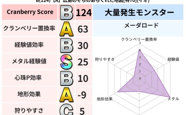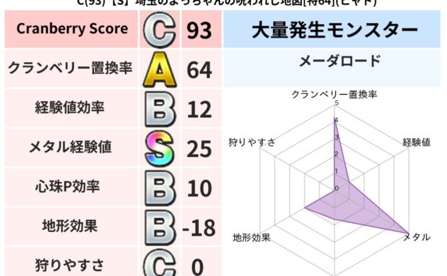 クランベリーボット判定結果の詳細クランベリースコア:139クランベリー置換率:63%大量発生モンスター:メーダロードイオ超耐性(8%)超耐性・弱耐性なし:バギこころ道 完全一致モンスターみならいあくまニンジャ(風道Lv5)くさった死体ゴッド...
