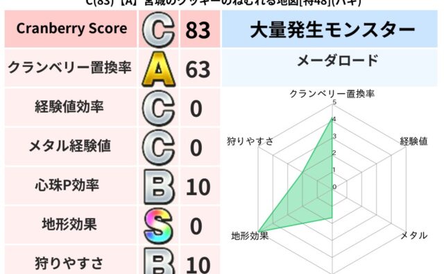 地図判定結果 C(83)【A】宮城のクッキーのねむれる地図[特48](バギ) クランベリーボット判定結果の詳細クランベリースコア:83クランベリー置換率:63%大量発生モンスター:メーダロードバギ超耐性(0%)こころ道 完全一致モンスターデビルアーマー大神官(舞道Lv5)アイアンクック守り人(まもり道Lv5)メイジキ... 2024/02/12 09:41 地図判定結果