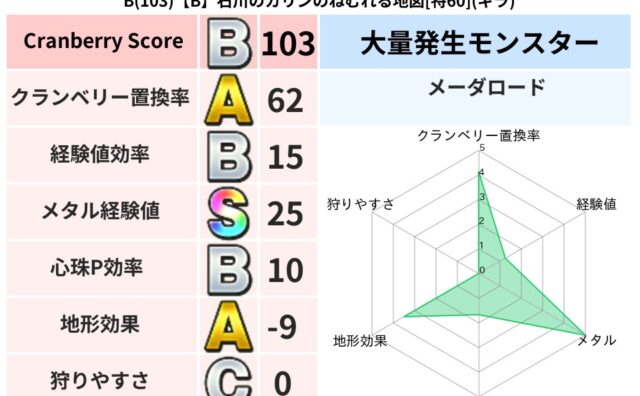 地図判定結果 B(103)【B】石川のカリンのねむれる地図[特60](ギラ) クランベリーボット判定結果の詳細クランベリースコア:103クランベリー置換率:62%大量発生モンスター:メーダロードギラ超耐性(7%)こころ道 完全一致モンスターどくどくゾンビ魔剣士(共通Lv1)ブラウニー守り人(共通Lv1)メーダロードゴ... 2024/01/29 09:29 地図判定結果