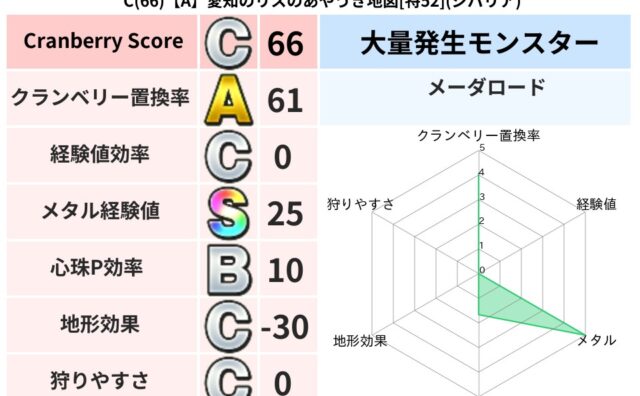 地図判定結果 C(85)【A】愛知のリスのあやうき地図[特52](ジバリア) クランベリーボット判定結果の詳細クランベリースコア:85クランベリー置換率:61%大量発生モンスター:メーダロードジバリア超耐性(0%)こころ道 完全一致モンスターキメラ: 大魔導士(共通Lv1)かっちゅうアリ: 魔人(共通Lv1)メーダロ... 2024/01/22 23:34 地図判定結果