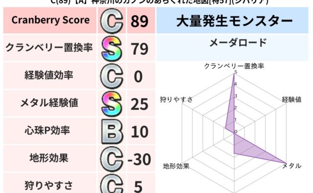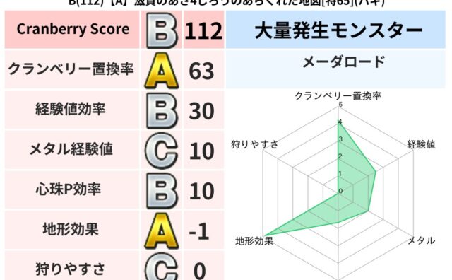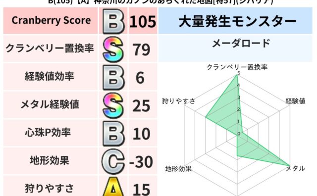 クランベリーボット判定結果の詳細クランベリースコア:95クランベリー置換率:65%大量発生モンスター:メーダロードデイン超耐性(54%)こころ道 完全一致モンスターどくどくゾンビ魔剣士(共通Lv1)キースドラゴン大魔導士(理力道Lv5)ジェ...
