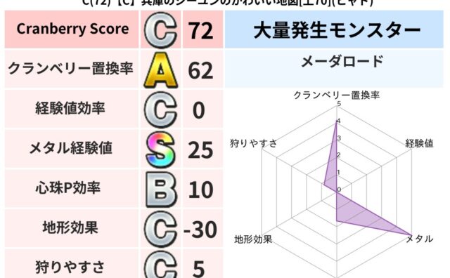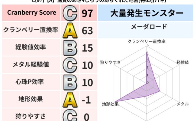 クランベリーボット判定結果の詳細クランベリースコア:110クランベリー置換率:65%大量発生モンスター:メーダロードデイン超耐性(0%)こころ道 完全一致モンスターどくどくゾンビ: 魔剣士(共通Lv1)キースドラゴン: 大魔導士(理力道Lv...