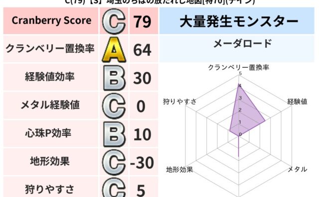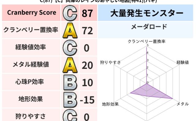 クランベリーボット判定結果の詳細クランベリースコア:144クランベリー置換率:34%大量発生モンスター:モコモコじゅう,メーダロードバギ超耐性(0%)こころ道 完全一致モンスターどくろあらい: ゴッドハンド(守護道Lv5)キメラ: 大魔導士...