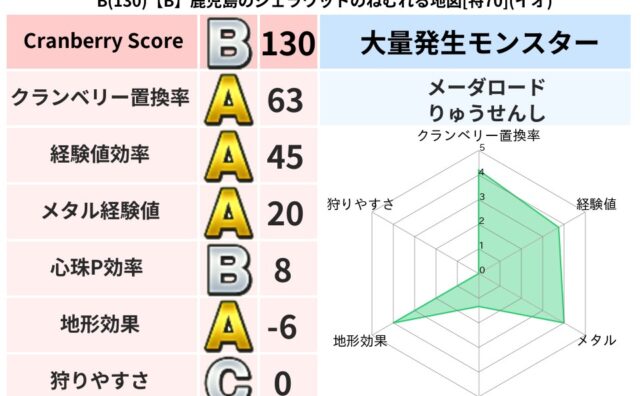 スコアA A(153)【C】茨城のチャンボのざわめく地図[特65](ギラ) クランベリーボット判定結果の詳細クランベリースコア:153クランベリー置換率:68%大量発生モンスター:スライムつむり,メーダロードギラ超耐性(0%)こころ道 完全一致モンスターねこまどう: ニンジャ(風道Lv5)デビルアーマー: 大神官(... 2024/12/26 20:26 スコアA地図判定結果