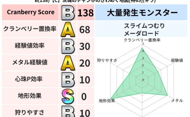 地図判定結果 B(138)【C】茨城のチャンボのざわめく地図[特65](ギラ) クランベリーボット判定結果の詳細クランベリースコア:138クランベリー置換率:68%大量発生モンスター:スライムつむり,メーダロードギラ超耐性(0%)こころ道 完全一致モンスターねこまどうニンジャ(風道Lv5)デビルアーマー大神官(舞道Lv... 2024/12/26 20:26 地図判定結果