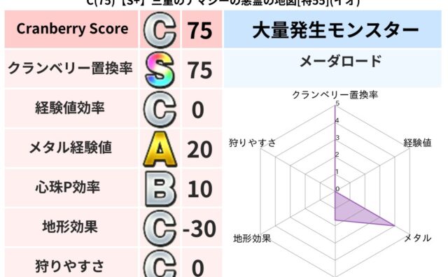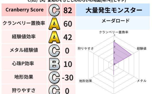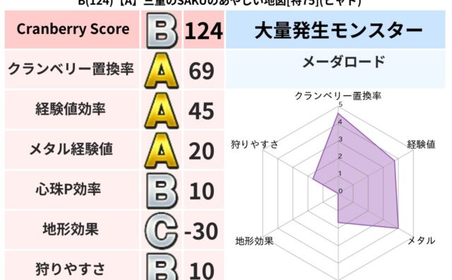 クランベリーボット判定結果の詳細クランベリースコア:124クランベリー置換率:39%大量発生モンスター:メトロゴースト,メーダロードジバリア超耐性(1%)こころ道 完全一致モンスターどくどくゾンビ: 魔剣士(共通Lv1)リカントマムル: ド...