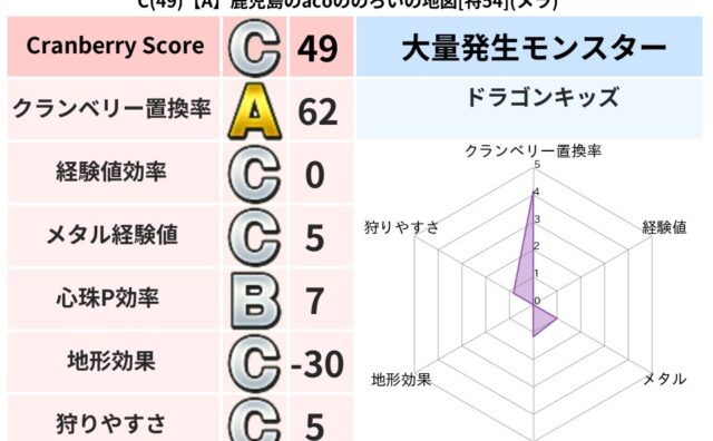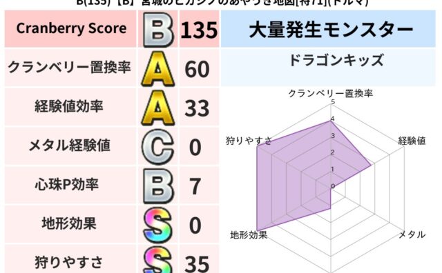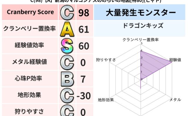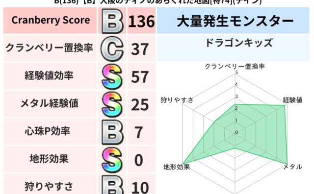 クランベリーボット判定結果の詳細クランベリースコア102クランベリー置換率62%大量発生モンスタードラゴンキッズ超耐性バギ(76%)こころ道 完全一致モンスターくさった死体ゴッドハンド(守護道Lv5)大魔道士(魔力道Lv5)キースドラゴン大...