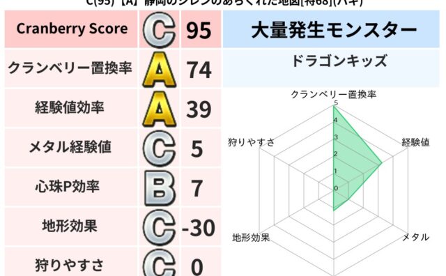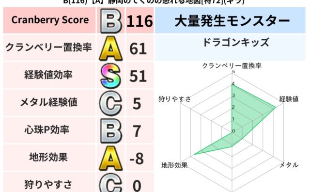 地図判定結果 B(116)【A】静岡のてくのの怒れる地図[特72](ギラ) クランベリーボット判定結果の詳細クランベリースコア:116クランベリー置換率:61%大量発生モンスター:ドラゴンキッズギラ超耐性(7%)こころ道 完全一致モンスターデビルアーマー大神官(舞道Lv5)うみぼうず守り人(まもり道Lv10)キャタ... 2025/09/01 19:15 地図判定結果