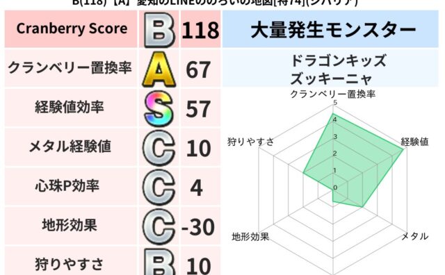 地図判定結果 B(118)【A】愛知のLINEののろいの地図[特74](ジバリア) クランベリーボット判定結果の詳細クランベリースコア:118クランベリー置換率:67%大量発生モンスター:ドラゴンキッズ,ズッキーニャジバリア超耐性(54%)系統狩り(40%)こころ道 完全一致モンスターみならいあくまニンジャ(風道Lv5)キ... 2025/09/05 23:32 地図判定結果