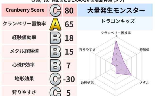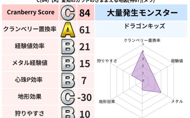 クランベリーボット判定結果の詳細クランベリースコア:83クランベリー置換率:67%大量発生モンスター:ドラゴンキッズバギ超耐性(57%)こころ道 完全一致モンスターどくどくゾンビ: 魔剣士(共通Lv1)かっちゅうアリ: 魔人(共通Lv1)イ...