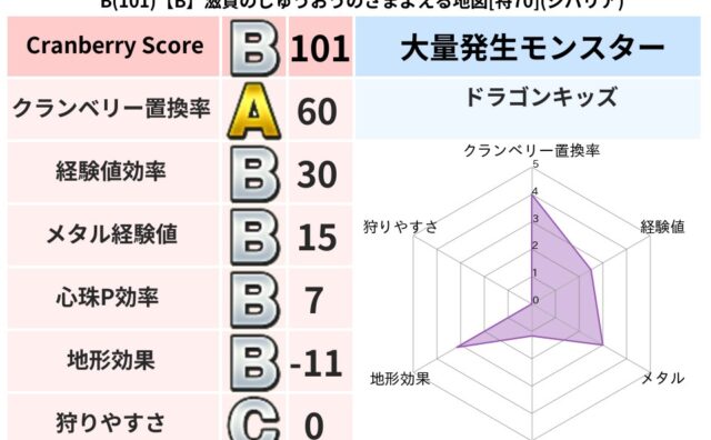 クランベリーボット判定結果の詳細クランベリースコア:131クランベリー置換率:60%大量発生モンスター:ドラゴンキッズジバリア超耐性(9%)こころ道 完全一致モンスターがいこつ: 魔剣士(共通Lv1)さまようよろい: ゴッドハンド(守護道L...