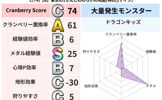 クランベリーボット判定結果の詳細クランベリースコア80クランベリー置換率61%大量発生モンスタードラゴンキッズ超耐性ジバリア(0%)こころ道 完全一致モンスターキメラ大魔道士(共通Lv1)おおさそりゴッドハンド(武道Lv5)ドラゴン(共通L...