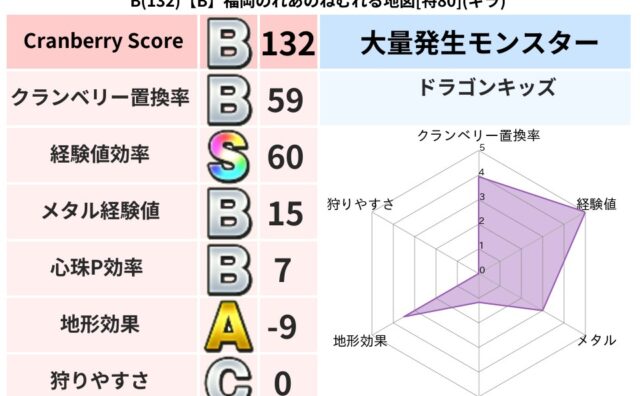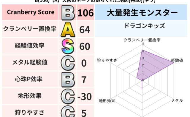 クランベリーボット判定結果の詳細クランベリースコア122クランベリー置換率60%大量発生モンスターさそりばち,ドラゴンキッズ超耐性ドルマ(5%)こころ道 完全一致モンスターどくろあらいゴッドハンド(守護道Lv5)てつのさそりゴッドハンド(守...