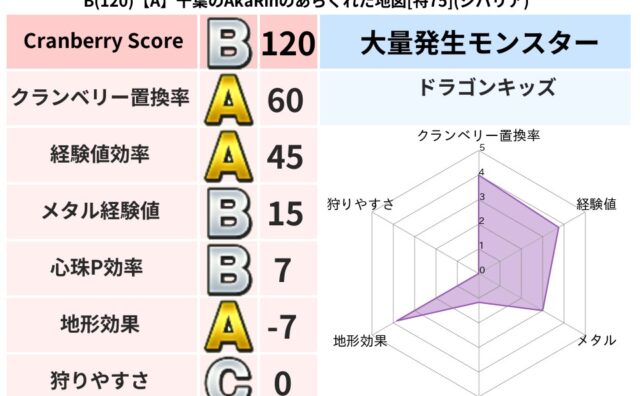 クランベリーボット判定結果の詳細クランベリースコア123クランベリー置換率77%大量発生モンスタードラゴンキッズ超耐性イオ(78%)超耐性・弱耐性なしドルマ系統狩りドラゴン系40%こころ道 完全一致モンスターどくろあらいゴッドハンド(守護道...