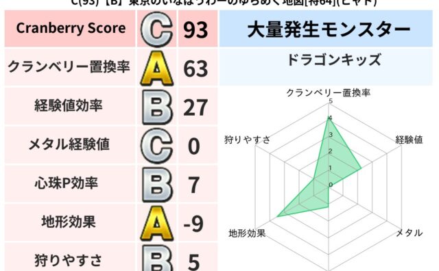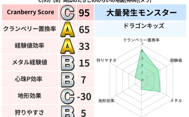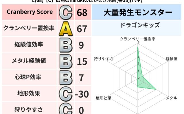 地図判定結果 C(83)【C】広島のharukiのはかなき地図[特58](バギ) クランベリーボット判定結果の詳細クランベリースコア:83クランベリー置換率:67%大量発生モンスター:ドラゴンキッズバギ超耐性(57%)こころ道 完全一致モンスターどくどくゾンビ: 魔剣士(共通Lv1)かっちゅうアリ: 魔人(共通Lv1)イ... 2025/02/02 20:48 地図判定結果