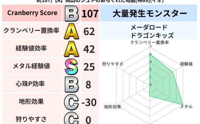 地図判定結果 B(122)【A】岡山のシュドのあらくれた地図[特69](イオ) クランベリーボット判定結果の詳細クランベリースコア:122クランベリー置換率:62%大量発生モンスター:メーダロード,ドラゴンキッズイオ超耐性(61%)こころ道 完全一致モンスターかっちゅうアリ: 魔人(共通Lv1)メーダロード: ゴッドハ... 2025/01/06 09:45 地図判定結果
