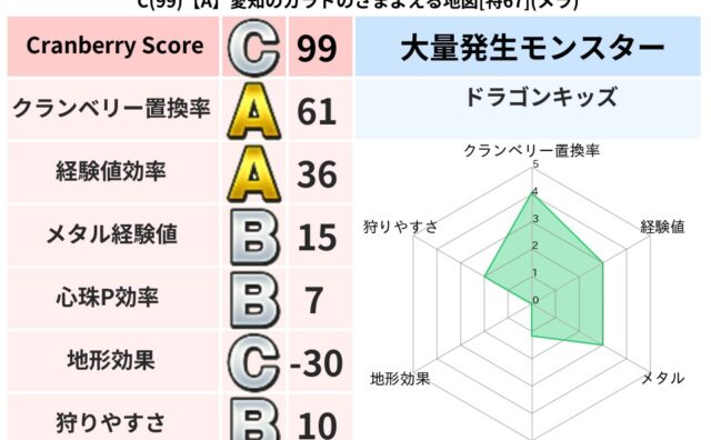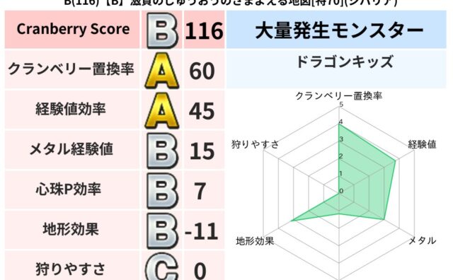 地図判定結果 B(126)【A】遠く離れた地のネルのあらくれた地図[特70](ドルマ) クランベリーボット判定結果の詳細クランベリースコア:126クランベリー置換率:42%大量発生モンスター:ドラゴンキッズドルマ超耐性(6%) 2025/01/05 22:21 地図判定結果