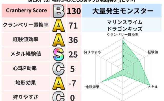 地図判定結果 B(145)【B】福岡の4ひえたのあやうき地図[特67](ヒャド) クランベリーボット判定結果の詳細クランベリースコア:145クランベリー置換率:71%大量発生モンスター:マリンスライム,ドラゴンキッズヒャド超耐性(6%)こころ道 完全一致モンスターパペットマン: 天地雷鳴士(天道Lv5)おおさそり: ゴッ... 2024/12/22 23:56 地図判定結果