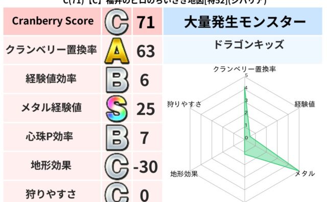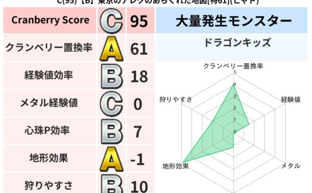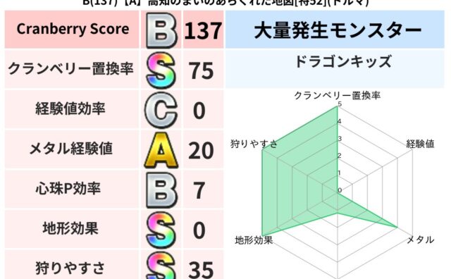 地図判定結果 B(137)【A】高知のまいのあらくれた地図[特52](ドルマ) クランベリーボット判定結果の詳細クランベリースコア137クランベリー置換率75%大量発生モンスタードラゴンキッズ超耐性ドルマ(0%)系統狩りドラゴン系52%こころ道 完全一致モンスターギズモ天地雷鳴士(共通Lv1)しりょうのきし大神官(舞道... 2024/09/09 21:02 地図判定結果置換率S