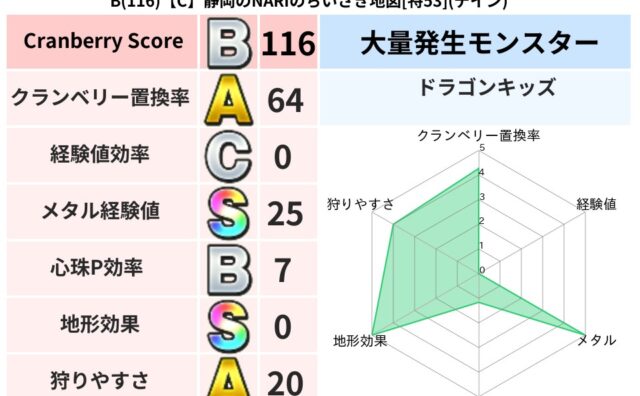 地図判定結果 B(116)【C】静岡のNARIのちいさき地図[特53](デイン) クランベリーボット判定結果の詳細クランベリースコア116クランベリー置換率64%大量発生モンスタードラゴンキッズ超耐性デイン(0%)こころ道 完全一致モンスターばくだん岩大神官(舞道Lv5)ストーンマンゴッドハンド(守護道Lv5)ドロルメイ... 2024/10/23 23:15 地図判定結果
