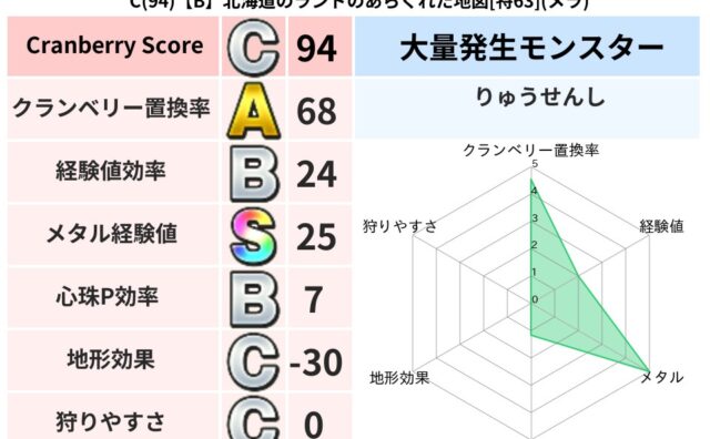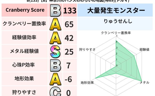 クランベリーボット判定結果の詳細クランベリースコア115クランベリー置換率63%大量発生モンスターメーダロード,りゅうせんし超耐性イオ(5%)こころ道 完全一致モンスターストーンマンゴッドハンド(守護道Lv5)メーダロードゴッドハンド(武道...