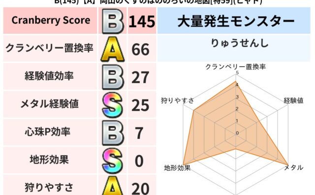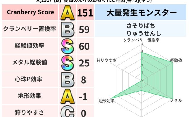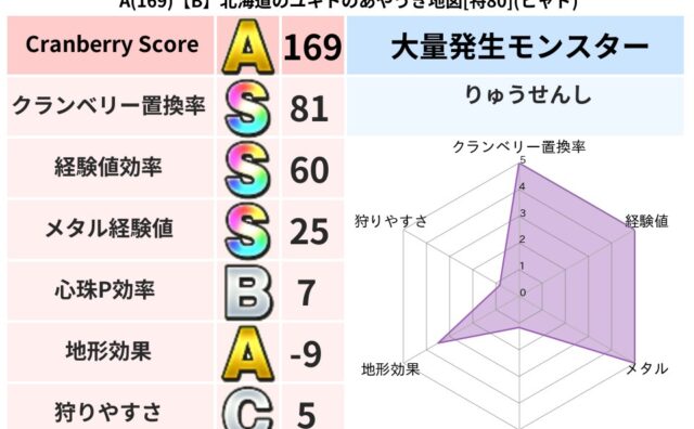 クランベリーボット判定結果の詳細クランベリースコア169クランベリー置換率81%大量発生モンスターりゅうせんし超耐性ヒャド(7%)系統狩りドラゴン系55%こころ道 完全一致モンスターフレイム守り人(ささえ道Lv5)デビルアーマー大神官(舞道...