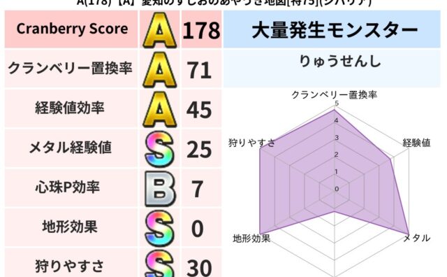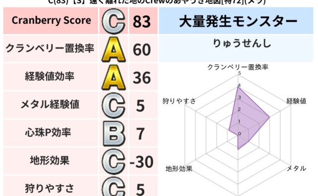 クランベリーボット判定結果の詳細クランベリースコア111クランベリー置換率61%大量発生モンスターりゅうせんし超耐性ジバリア(1%)こころ道 完全一致モンスターキースドラゴン大魔道士(理力道Lv5)ギズモ天地雷鳴士(共通Lv1)さまようたま...