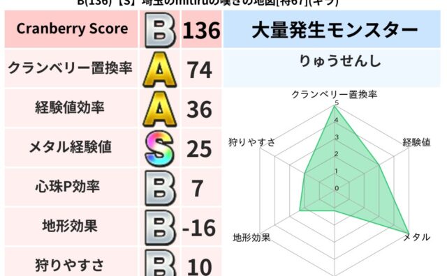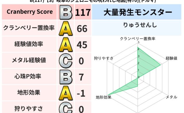 クランベリーボット判定結果の詳細クランベリースコア87クランベリー置換率65%大量発生モンスターりゅうせんし超耐性ギラ(55%)こころ道 完全一致モンスターがいこつ魔剣士(共通Lv1)つかいま大魔道士(理力道Lv5)グリゴンダンス魔人(超魔...