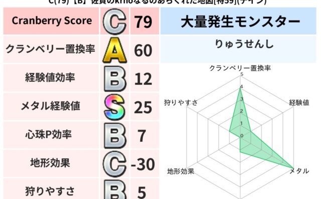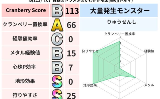 クランベリーボット判定結果の詳細クランベリースコア111クランベリー置換率74%大量発生モンスターりゅうせんし超耐性ギラ(14%)系統狩り虫系44%こころ道 完全一致モンスターがいこつ魔剣士(共通Lv1)かっちゅうアリ魔人(共通Lv1)てつ...