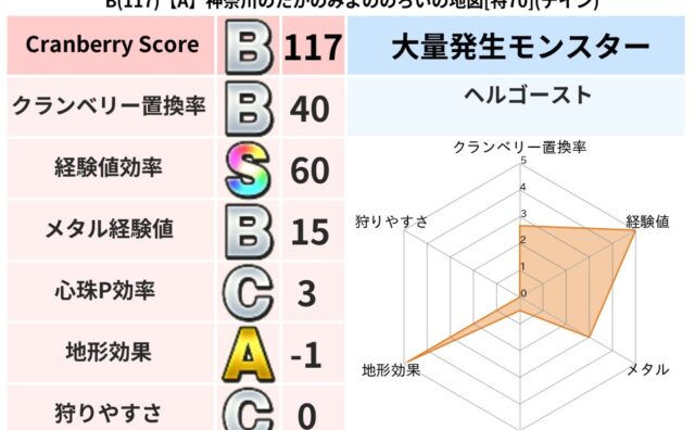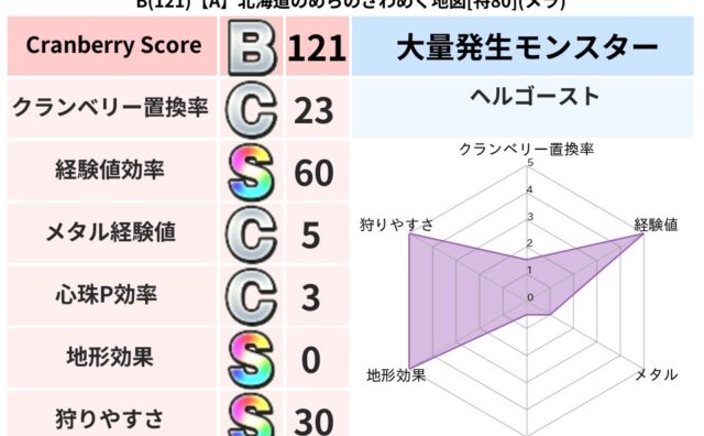 クランベリーボット判定結果の詳細クランベリースコア121クランベリー置換率23%大量発生モンスターヘルゴースト超耐性メラ(0%)こころ道 完全一致モンスタードロヌーバニンジャ(波道Lv5)ブラウニー守り人(共通Lv1)グリゴンダンス魔人(超...