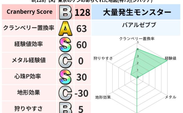 地図判定結果 B(128)【A】東京のケンのあらくれた地図[特75](ジバリア) クランベリーボット判定結果の詳細クランベリースコア128クランベリー置換率63%大量発生モンスターバアルゼブブ超耐性ジバリア(52%)超耐性・弱耐性なしバギこころ道 完全一致モンスターパペットマン天地雷鳴士(天道Lv5)おおさそりゴッドハン... 2025/10/13 18:03 地図判定結果