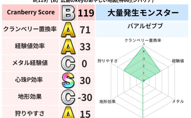 地図判定結果 B(119)【B】広島のkeyのあやしい地図[特66](ジバリア) クランベリーボット判定結果の詳細クランベリースコア119クランベリー置換率71%大量発生モンスターバアルゼブブ超耐性ジバリア(69%)超耐性・弱耐性なしメラギラバギこころ道 完全一致モンスターブラウニー守り人(共通Lv1)どれいへいしドラゴ... 2025/10/09 20:39 地図判定結果